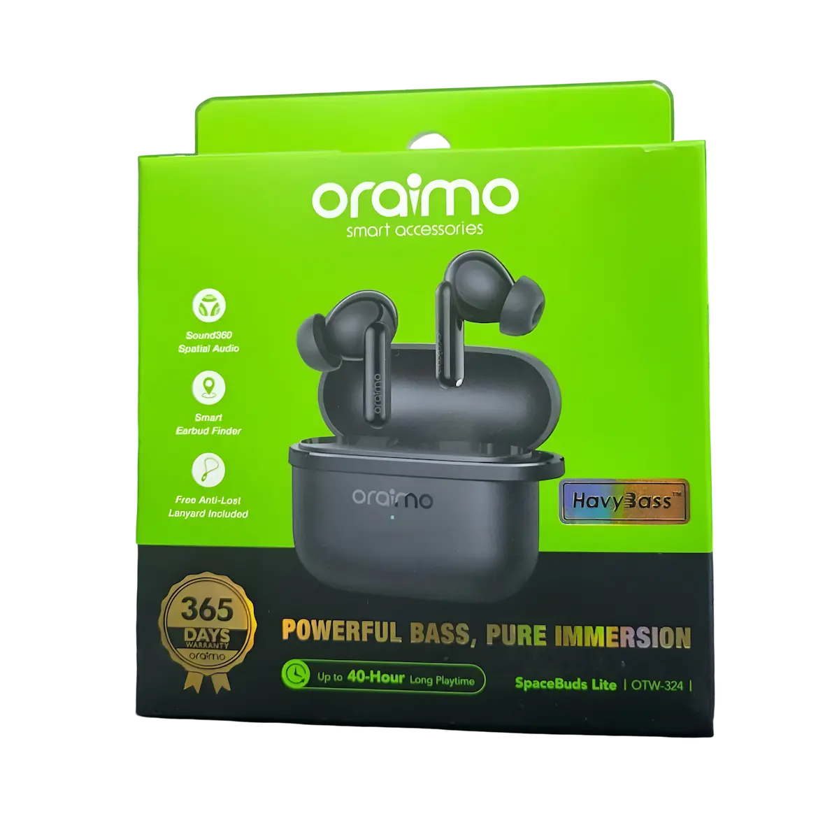 The SpaceBuds Lite (OTW-324) are true wireless Oraimo earbuds offering up to 40 hours of total playtime, spatial “Sound360” audio, and a smart anti-lost lanyard plus a find-earbuds feature via the Oraimo Sound app. They also include dual mics with AI noise-cancellation for clear calls, and a low-latency game mode, all wrapped in a sweat-resistant (IPX4) design.
